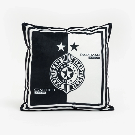 Jastučić Partizan 45x45 – crno-beli dizajn sa grbom i natpisom “Crno-beli, dajte gol”. Mekan pliš i periva navlaka za pravi navijački stil!